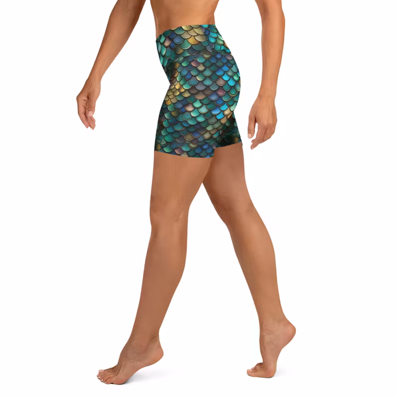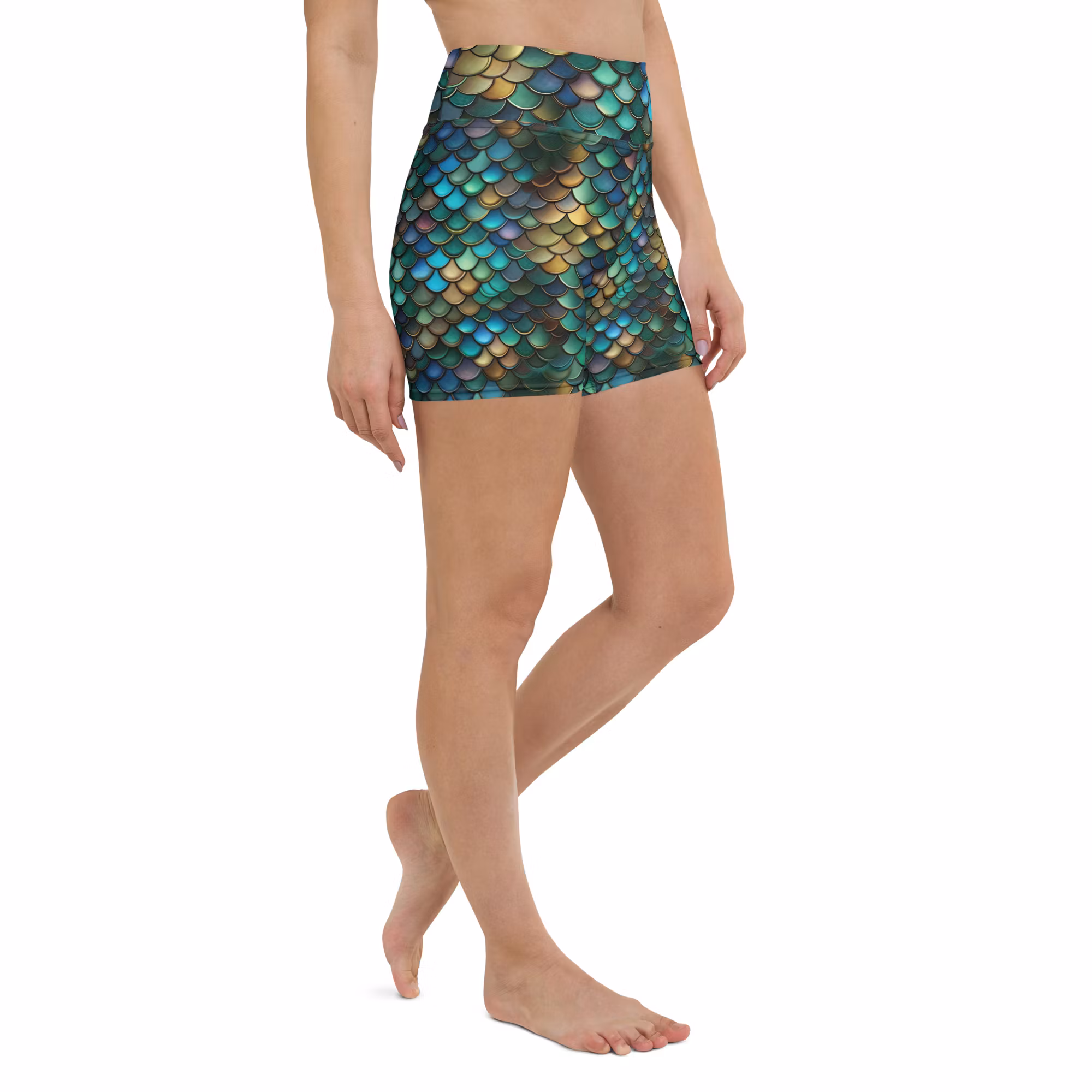 Yogashorts/bikinitrosor med ben. Motiv av skimrande fjäll. Smidiga, stretchiga yoga/bikinishorts med brett midjeband och ben. Lika sköna för doppet som för yogamattan.