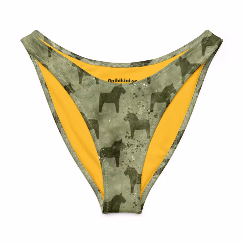 V-formad bikinitrosa, gröna med dalahästar. Helfodrad med högt skurna ben.