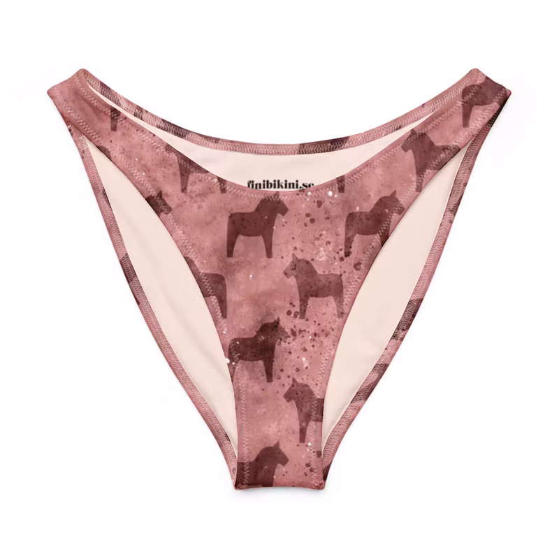 V-formad bikinitrosa, rosa med dalahästar. Helfodrad med högt skurna ben.