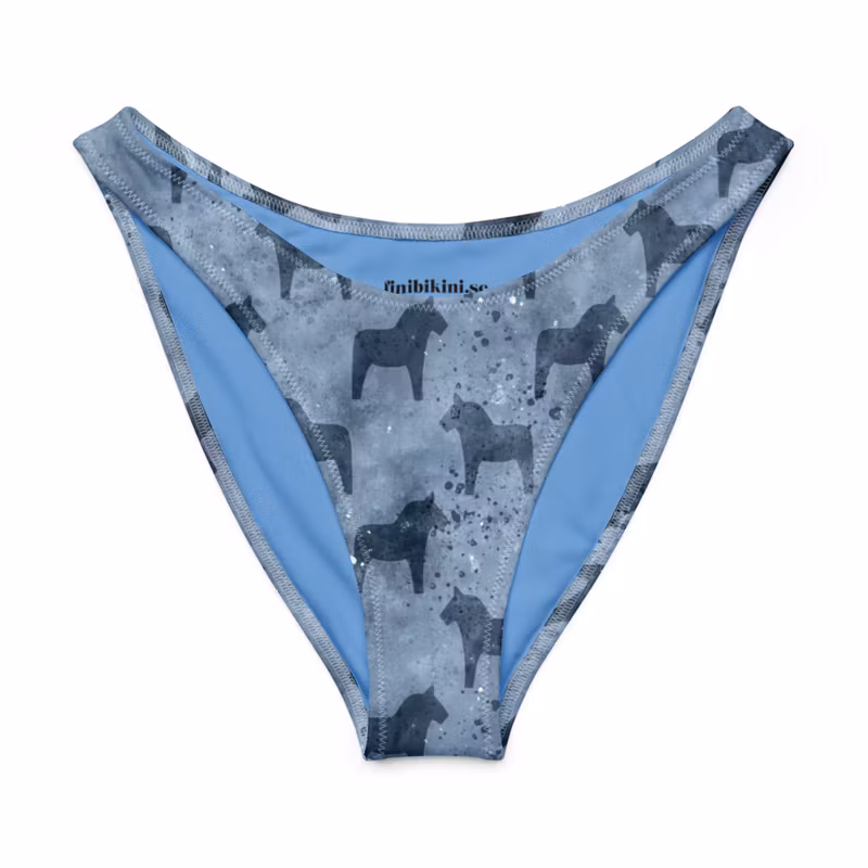V-formad bikinitrosa, blå med dalahästar. Helfodrad med högt skurna ben.
