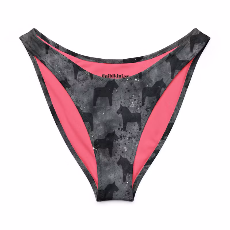 V-formad bikinitrosa, skogsgrön med dalahästar. Helfodrad med högt skurna ben.