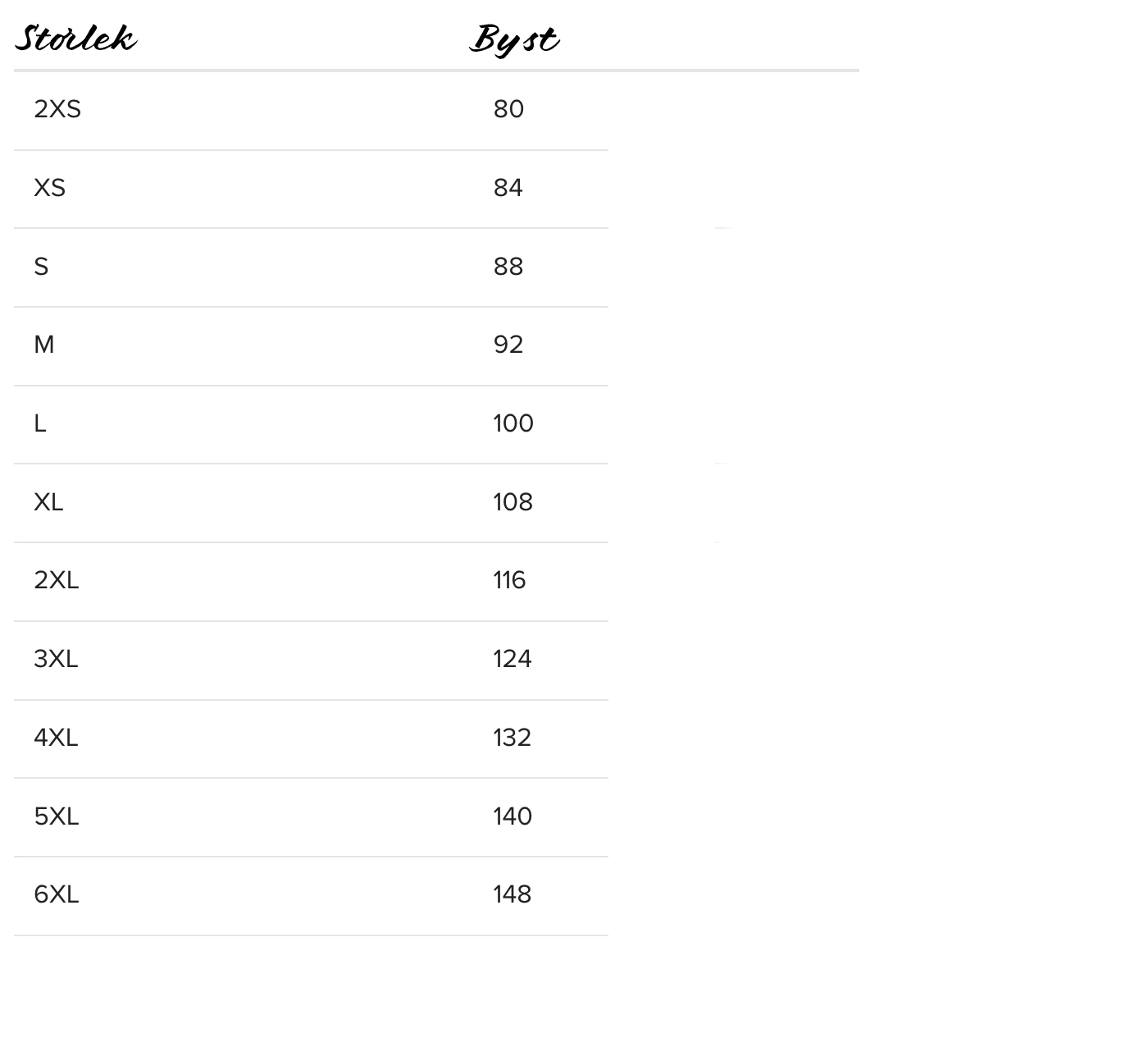 Storlekstabell - kroppsmått i centimeter