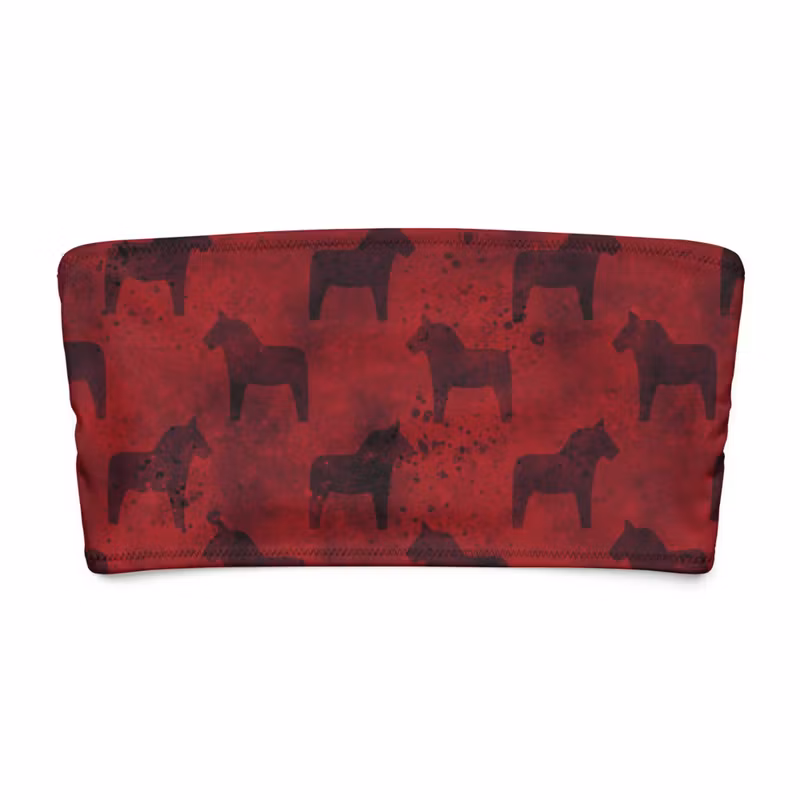 Bandeau bikinitop, röd med dalahästar. Helfodrad bikinitop med brett band runtom.