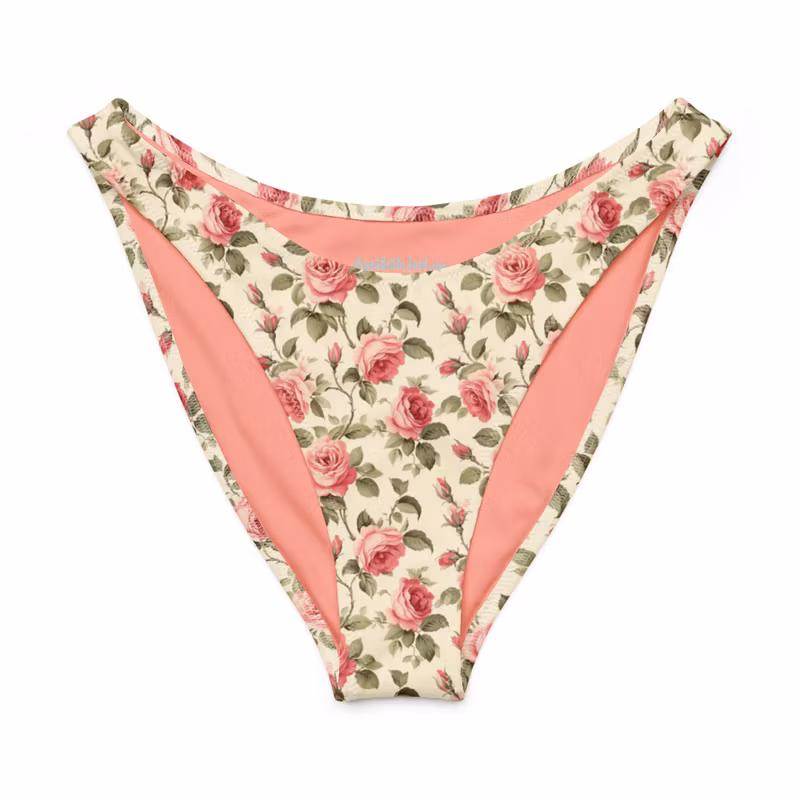 V-formad bikinitrosa med rosor. Helfodrad med högt skurna ben.