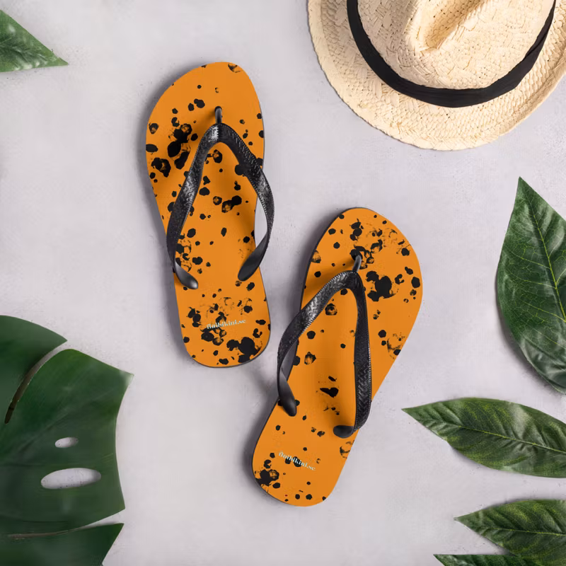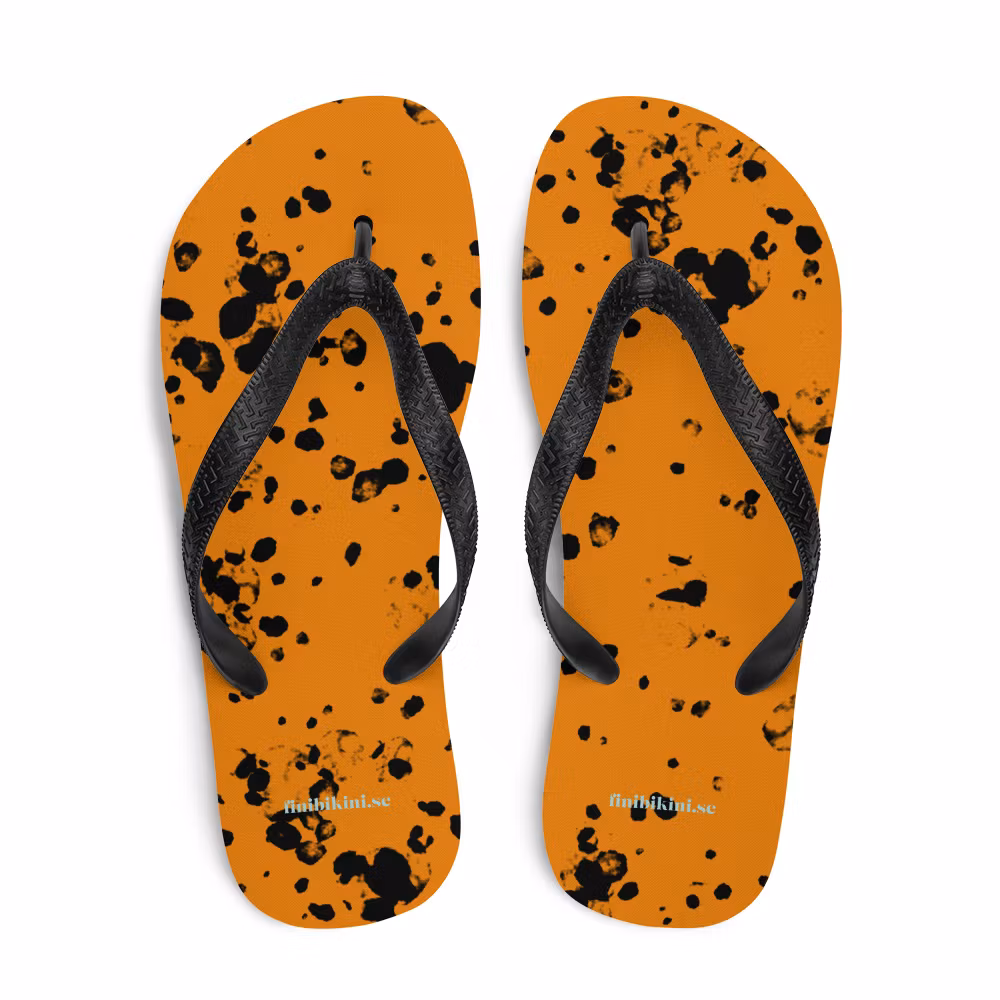 Oranga flip-flops med svart mönster. Strandens och semesterns självklara sko.